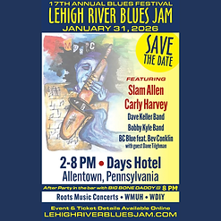 17 ANNUAL LEHIGH RIVER BLUES JAM This not-to-miss Winter Blues Festival returns on Jan. 31 at the Days Hotel in Allentown, PA, from 2-8 PM. Each band will reel you in with a diverse offering of Blues, Funk, Soul, and whatever it takes to adjust whatever is ailing you. This year's performers include Slam Allen, Carly Harvey, Dave Keller Band, Bobby Kyle Band, and BC Blue featuring Bev Conklin with guest Dane Tilghman. The after party in the Hotel's Jetport Bar will feature Big Bone Daddy.